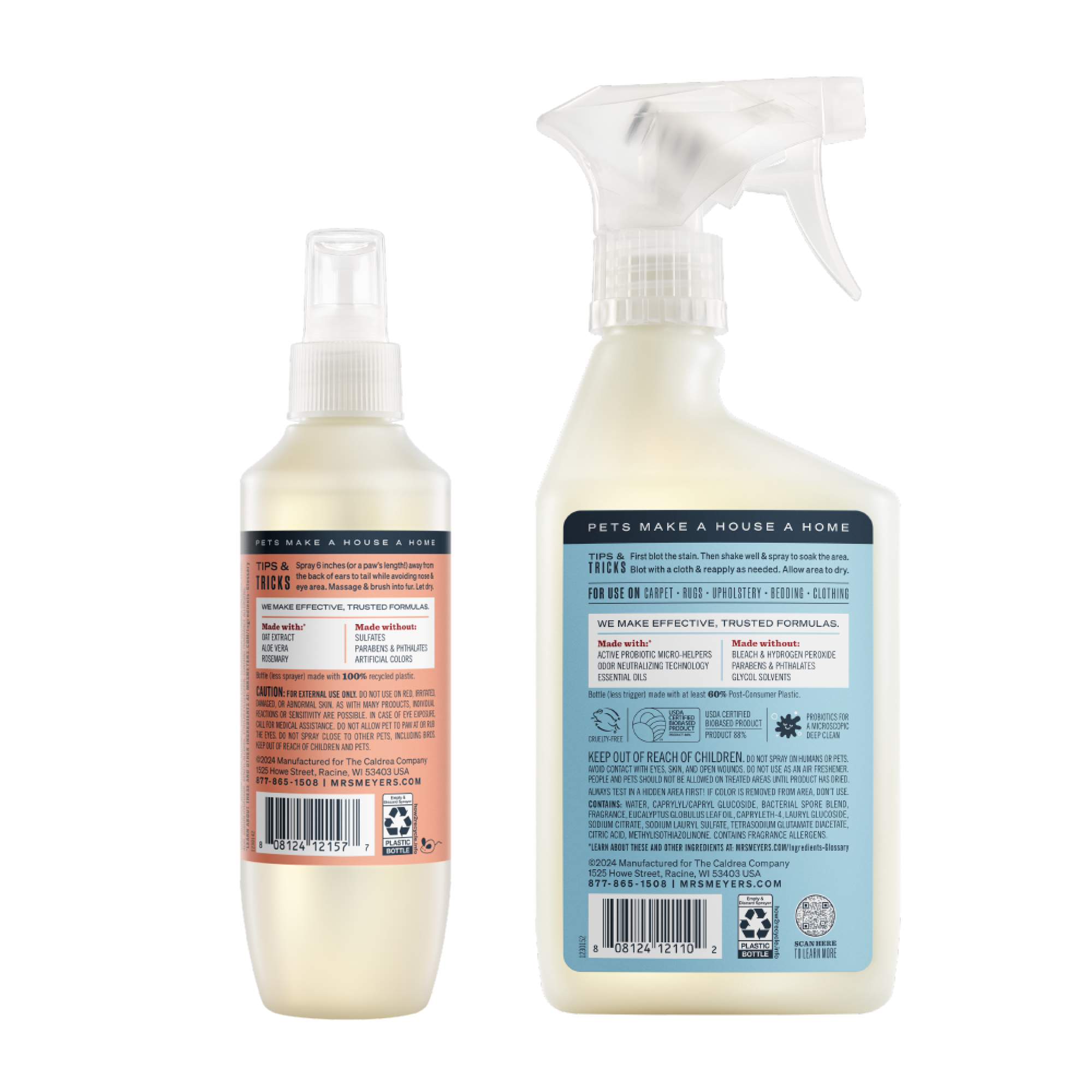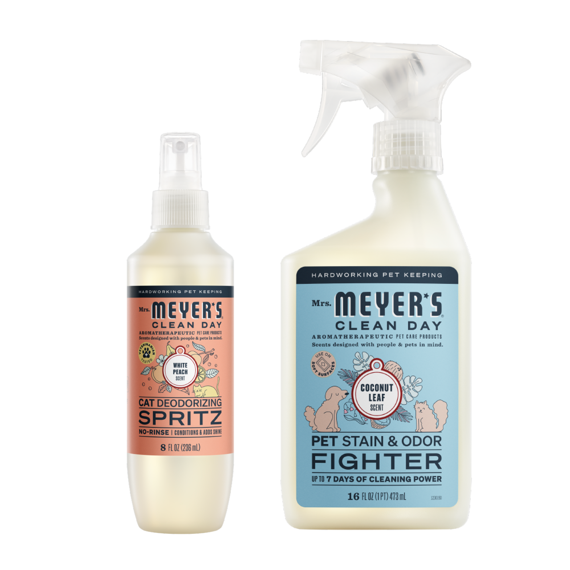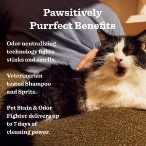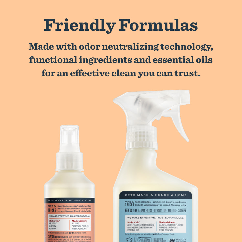 This hardworking bundle features two just-for-cats grooming and cleaning products: Cat Deodorizing Spritz and Pet Stain & Odor Fighter. Our grooming products are veterinarian tested, and pH balanced specifically for cats, while our cleaning products are made with odor neutralizing technology and our special formula of active probiotic micro-helpers to tame pet messes and smells. Because every home with a pet deserves a clean day.