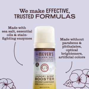 - Mrs. Meyer’s Scent Boosters work in conventional and HE washing machines